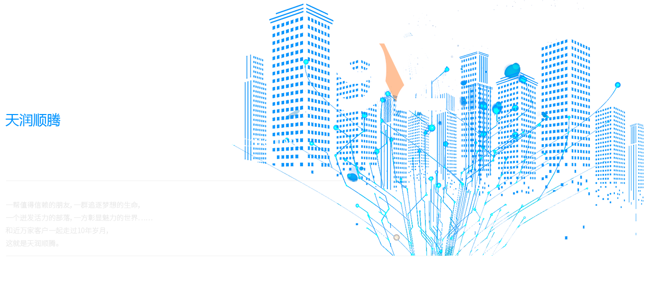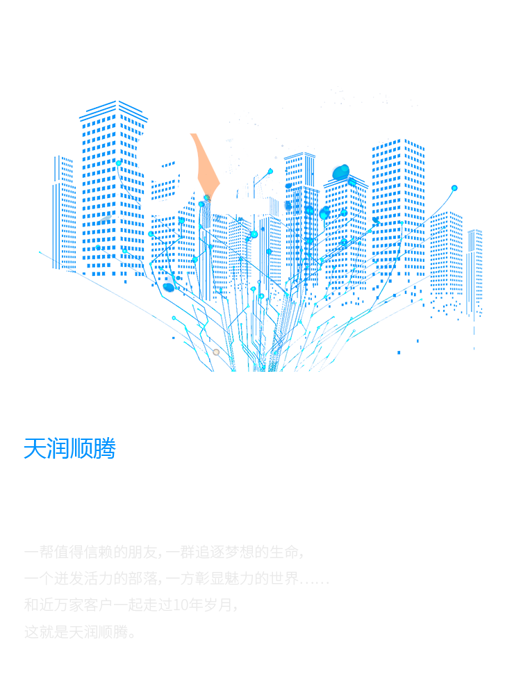 一幫值得信賴的朋友,一群追逐夢(mèng)想的生命, 一個(gè)迸發(fā)活力的部落,一方彰顯魅力的世界…… 和近萬(wàn)家客戶一起走過10年歲月, 這就是天潤(rùn)順騰。